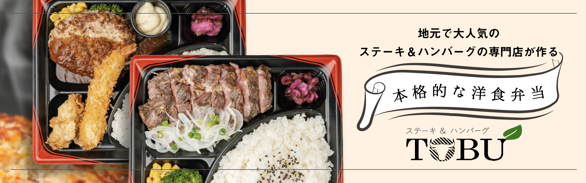 おいしいステーキとハンバーグが食べられる大人気の飲食店「TOBU」冷めても柔らかいふんわりハンバーグが自慢です。ハンバーグの味を引き立てる4種類のソースをご用意しました。お好みでお選びください!地元で大人気のステーキ&ハンバーグの専門店が作る本格的な洋食弁当をお届けします!