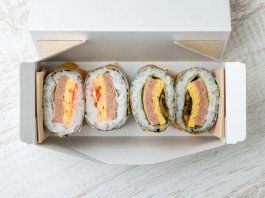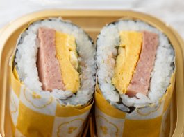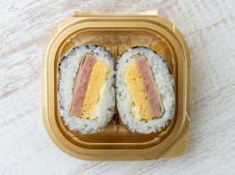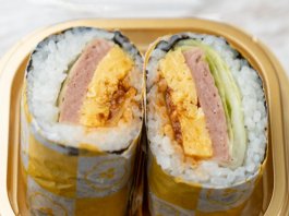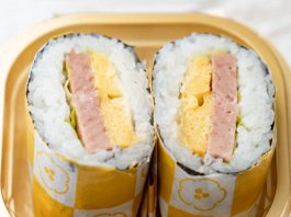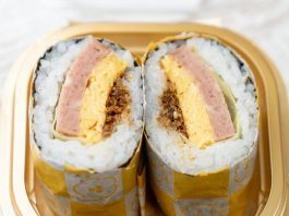 厚焼き玉子、スパム、酢飯を使用したお寿司屋さん風のポークたまごおにぎりです。