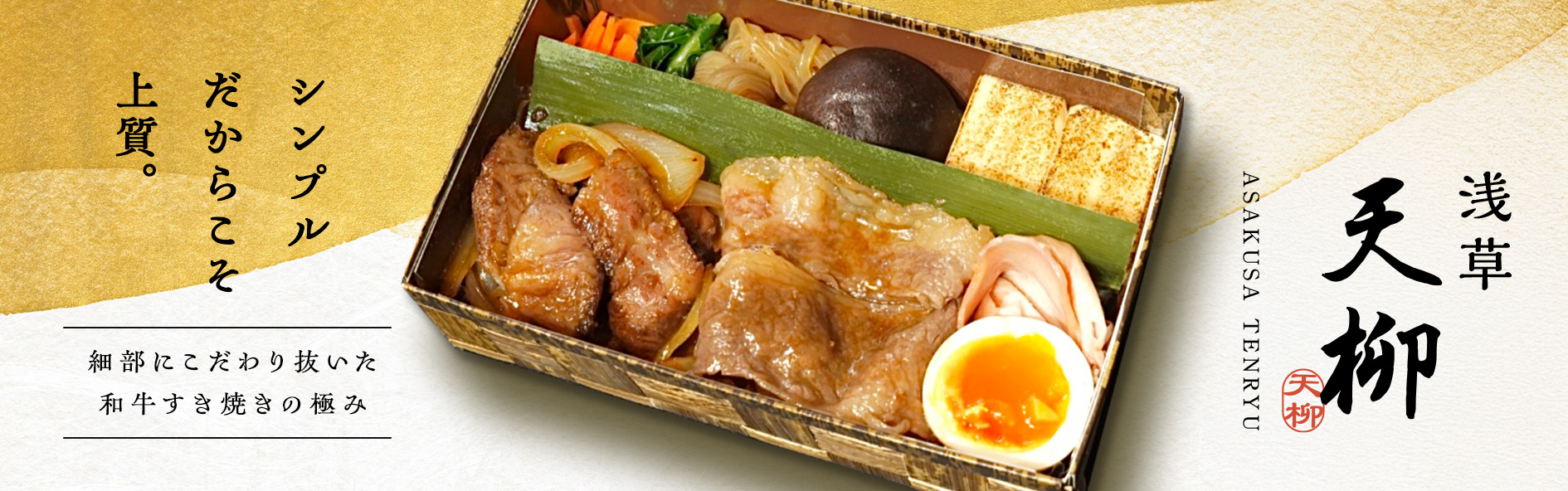 浅草のすき焼き弁当専門店です。 シンプルなすき焼き弁当だからこそ、細部までこだわり抜き、素材の良さを引き出した最高の一品を作りました。丁寧に焼き上げた上質な和牛と厳選素材を使用した逸品をぜひご賞味ください。