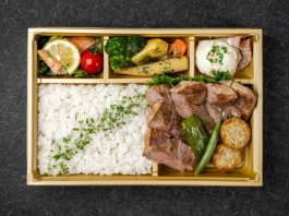国産牛ステーキをメインに、ご飯、ポテトサラダ、焼魚、季節の副菜が彩り豊かに盛り込まれた洋食弁当。贅沢な味わいと華やかな見た目で、特別な日のランチにぴったりです。